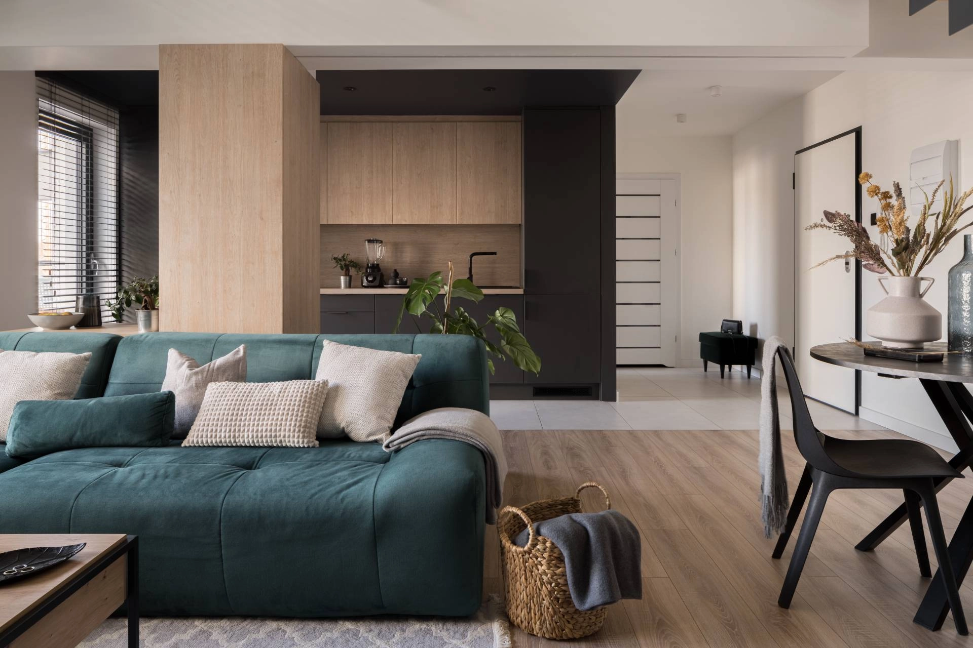 Wood blinds are one of the most versatile transitional window treatments. Their clean horizontal lines bring structure to a space, while warm finishes add softness. Wood and faux wood blinds pair beautifully with neutral upholstery and subtle patterns. They offer excellent light control while maintaining a tailored look.